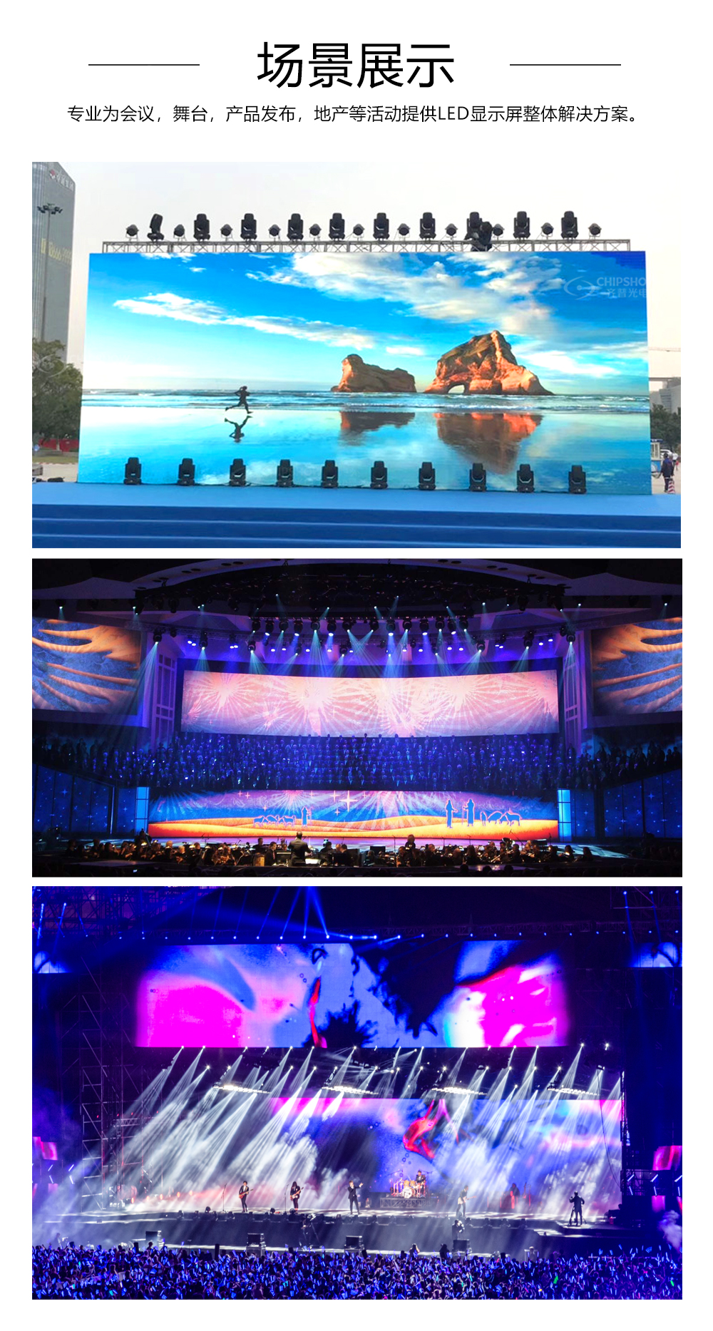 8、户外通配P1.9/2.6/2.97/3.9等像素间距,专业为会议,舞美,发布会等活动提供LED租赁显示整体解决方案。